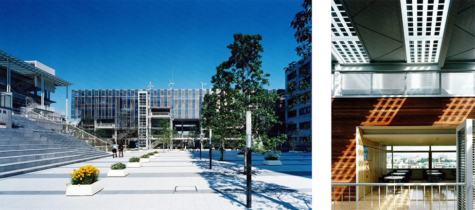 大東文化大学板橋キャンパスは12社のコンペで獲得したもので、敷地に余裕がなかったために他の案はほとんど隙間を縫って建てる、アクロバットな超高層キャンパス案だった。私は大学の基本は中庭(クオドラングル)にあるとし、周辺に5層の4棟が中庭を囲み、中央に情報棟を配置した水平移動によるコミュニティを生み出すスパイン空間をもったキャンパスを提案、北側の教室群の場所に教室棟を計画した。これは一見不可能に見えるのだが、実は大学の再開発計画を埼玉大、日大工学部で行った経験によれば、教室の利用率は非常に低く、できるだけ利用率を高める計画を丁寧に議論して進めると、一つの棟は解体しても可能となると予想し、敷地東から約100mの教室棟を第一期に造った。