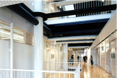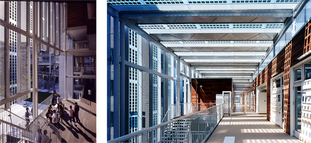 この棟と中央に図書館を作れば、第一期で基本的な機能を作れ、大学の運営には全く支障なく進めることができたのである。そして、教室棟に関してエネルギー利用を最小限にするためには、目的空間のみを機械空調(アクティブエネルギー)が必要なゾーン、教室棟全体の約8000㎡のその他の半分を全く空調しない外部空気(パッシブゾーン)と想定した。南の広場空間から教室棟に向かうとEVの前に外部吹抜の空間に達し、この奥は中廊下の一部ですぐに教室に入ることができる。